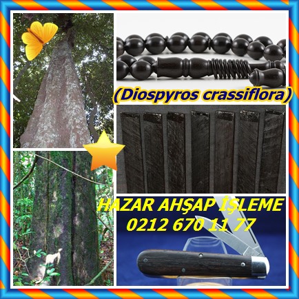 Tanım: D. crassiflora boyunda 25 metre orta ölçekli bir, yavaş büyüyen bir ağaç kadar.Bu yükseklik yaklaşık 1000 m’ye kadar, ova yarı yaprak döken ve dökmeyen orman içinde bulunan ve yağış ormanları önlemek eğilimindedir. Genellikle tek başına veya 2 ya da 3 ağaçların küçük bir grup içinde bulunan doğal ormanları, ortak bir ağaç değildir. Bu doğal aralığı boyunca seçici günlüğü ile hasat edilir ve odun Afrika’dan gerçek ticari abanoz olarak kabul edilir. Öz odun, ağacın kereste en ünlü parçası, simsiyah ya da siyah çizgiler ile çok koyu kahverengi.Çok yoğun ve ağır döşeme, gemi inşa, araç gövdeleri, bıçak sapları, gitar klavyelerde ve piyano en meşhuru, siyah tuşlar için kullanılmaktadır. ağaç kabuğu ve sap antibakteriyel ve anti-mantar özelliklerine sahip olduğu gösterilmiştir, ve bu hastalıkların tedavisi gibi çeşitli yardımcı geleneksel yerel tıpta kullanılmaktadır.D. crassiflora kereste yıldır aralık ülkelerin önemli bir ihracat ürünü olmuştur, ama hacimleri artan kıtlık, azalan muhtemelen olmuştur. Türlerin büyük ağaçlar neredeyse tüm uzak bölgelerde dahil olmak üzere, doğal aralığında gitti. Küçük türler yeniler nasıl bilinir, ancak bu doğal ormanlarda yani izole ve çok yavaş büyür, çünkü IUCN tarafından “Tehlikede” olarak listelenir. Hazar Ahşap İşleme Merkezi 0212 670 11 77 Dioecious orta ölçekli ağaç kadar 25 m boyunda; çapı 120 cm kadar, payandaların olmadan bole silindirik veya yivli kadar m 15 için şubesiz; ince boyuna çatlaklar, oldukça kalın ölçekler, siyah ve dış tabakasında kırılgan siyah, iç kabuğu ile siyahımsı gri olarak peeling ile kabuk yüzeyi, iç tabakasında krem ​​çizgiler ile somon pembe soluk; dalları boyuna çatlaklar ile gri-kahverengi, kırmızımsı; Genç dallar tüysüz. Alternatif, basit ve tüm Yapraklar; yoktur stipules; Yukarıda neredeyse tüysüz yivli uzun 1,5 cm, kadar yaprak sapı; Bıçak hançer-eliptik yuvarlak ve tabanı hafifçe asimetrik için, dikdörtgen eliptik 10-21 cm x 4-10 cm, cuneate için, aniden apeks, ince kösele, neredeyse tüysüz, parlak koyu yeşil yukarıdaki, solgun aşağıda pinnately damarlı de acuminate Yanal venlerin 5-8 çifti ile, en iyi damarlar dik damarları lateral. Genellikle yaşlı dallar üzerinde, bir aksiller fasikül çiçeklenme, erkek çiçeklenme için 3-6 çiçekli, kadın biri için 1-2 çiçekli. Çiçekler cins, düzenli, neredeyse sapsız; tüp ile uzun kaliks etli, 10 mm’ye kadar, pembemsi kırmızı, biraz daha uzun 5 lob daha; corolla elipsoid tüpü ile 2.5-3 cm uzunluğunda, kısa tüylü, etli, pembemsi beyaz ve 4-6 kısa loblar; Çok kısa filamentler ile 1,5 cm uzunluğunda sayısız organlarındaki, erkek çiçekler, yumurtalık gelişmemiş; ilkel organlarındaki, yumurtalık üstün, küreyle, c dişi çiçekler. Çapı 5 mm, 8-10 hücreli, stiller 4-5. Meyve kadar 10 cm 6.5 cm x obovoid berry bir elips, seyrek, tüysüz için kıllı sarımsı zaman olgun, 10 numaralı seribaşı kadar çapı 4 cm, genişlemiş çanak varan üssünde kapalı. 5 cm x 2 cm 1.5 × cm, siyah parlak kahverengi kadar dikdörtgen Tohumlar,.Hazar Ahşap İşleme Merkezi 0212 670 11 77